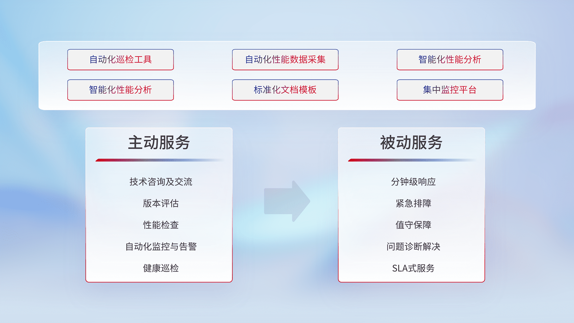 智能化工具和标准化文档,,,保障服务质量,,提供主动服务(包含技术咨询、、、、版本评估、、性能检查、、自动化监控与告警、、、、健康巡检)和被动服务包含(分钟级响应、、、紧急排障、、、、值守保障、、问题诊断解决、、、、SLA服务)。。